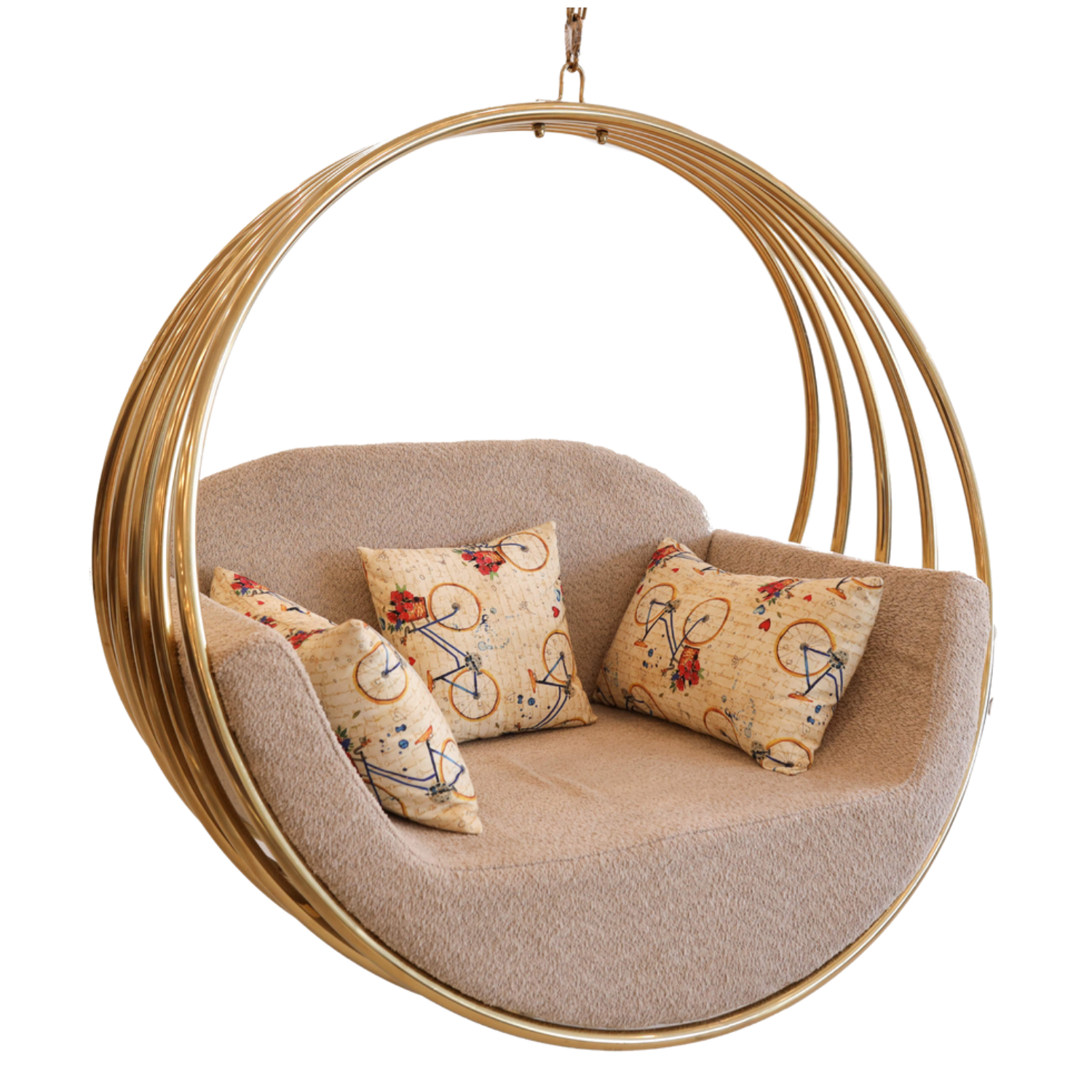 Elevate your space with this stylish 5 Ring swing featuring a luxurious gold PVD coating and ultra-comfy sofa-style cushioning. Perfect for indoor and outdoor use, it’s where comfort meets elegance.